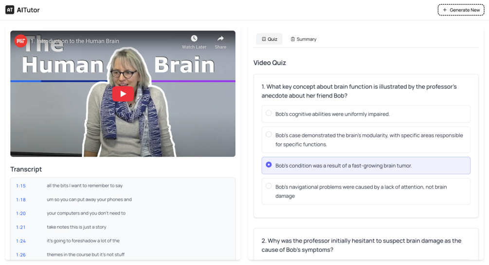 An AI-powered learning platform that transforms your study materials into interactive learning experiences. Just paste any youtube video link and get a transcript, quizzes and summary. More features coming soon.