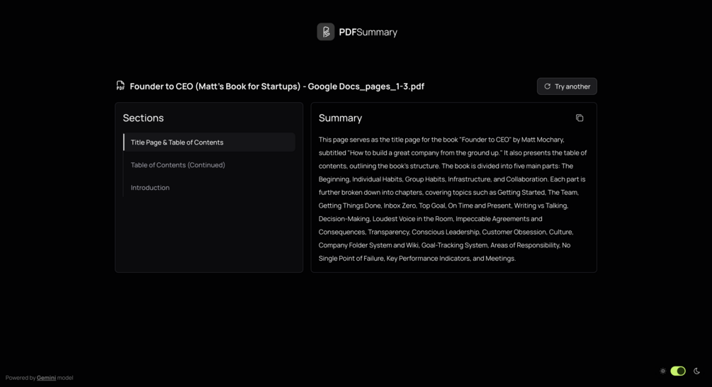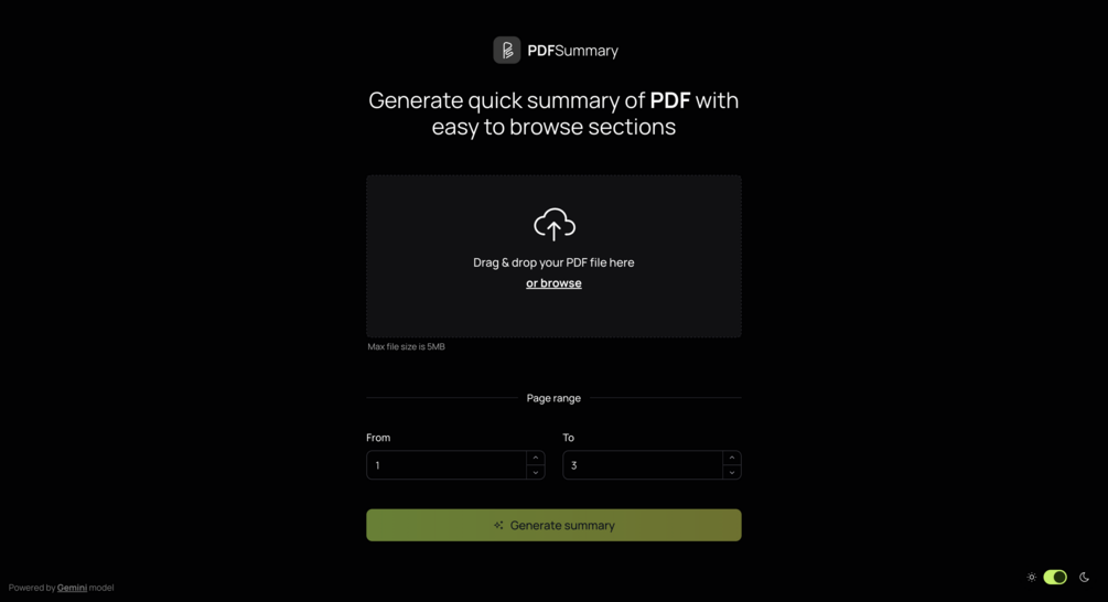 PDFSummary is a tool that allows you to summarize PDF files with ease. It uses AI under the hood to summarize the file and provide a summary of each page with a click of a button. Built on next.js, gemini and cloudflare stack. Can be used as perfect starting point to kickstart your next PDF AI project.